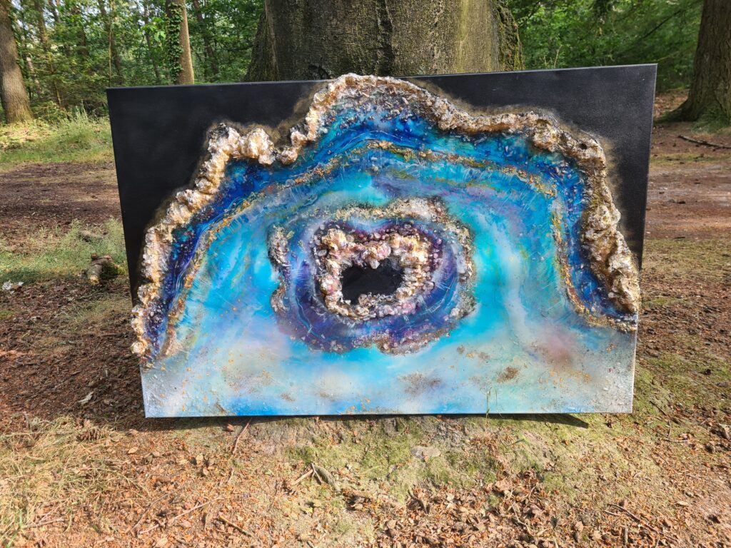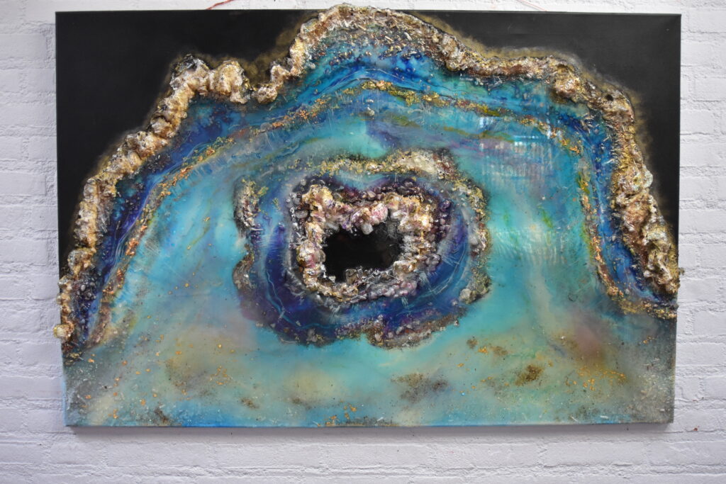 Tijdens het creatieproces vormde de 7 lagen hars een prachtig kleurenspel, waar het strandzand vanuit de diepte leek op te spatten. Haar kern geeft door de black hole het gevoel dat je door haar heen de diepte in kunt duiken in het duister, waar alles onbekend en onzichtbaar wordt. Daarentegen geeft haar krater en haar ruwe buitenzijde vol bergkristallen, seleniet, rozenkwarts, golden healers, koper en amethisten het gevoel dat bescherming in onze oceaan des levens, tijdens het rijden van de wave altijd voor handen is.