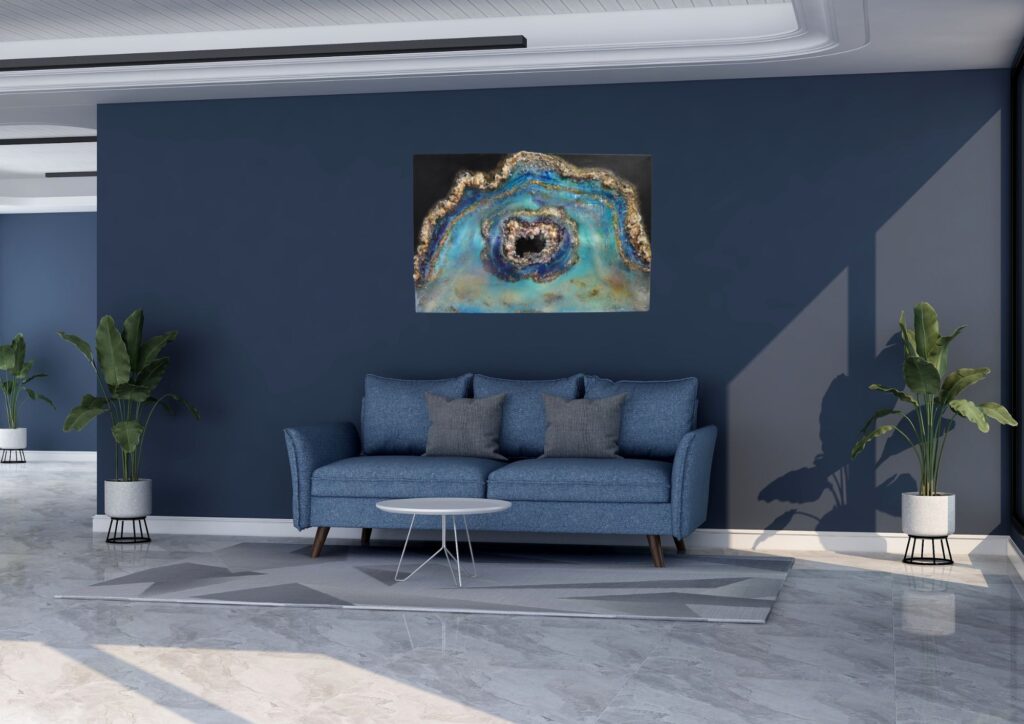 Dit kunstwerk neemt je mee in een diepe duik in de azuur blauwe oceaan. Wanneer de golven van het leven je de kans geven om de rit van je leven te maken, spring erin, en laat je meevoeren in haar kracht, expansie en de schatten die ze je brengt.