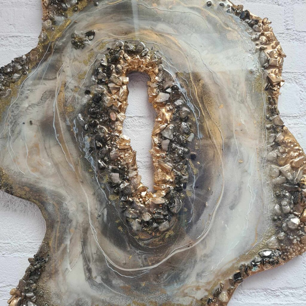 Het creatieproces: 7 lagen hars op mdf in grijs, wit, zwart en goud nuances, met echte edelstenen en kristallen. De achterzijde is afgewerkt met een laag epoxy en heeft een metalen haak.