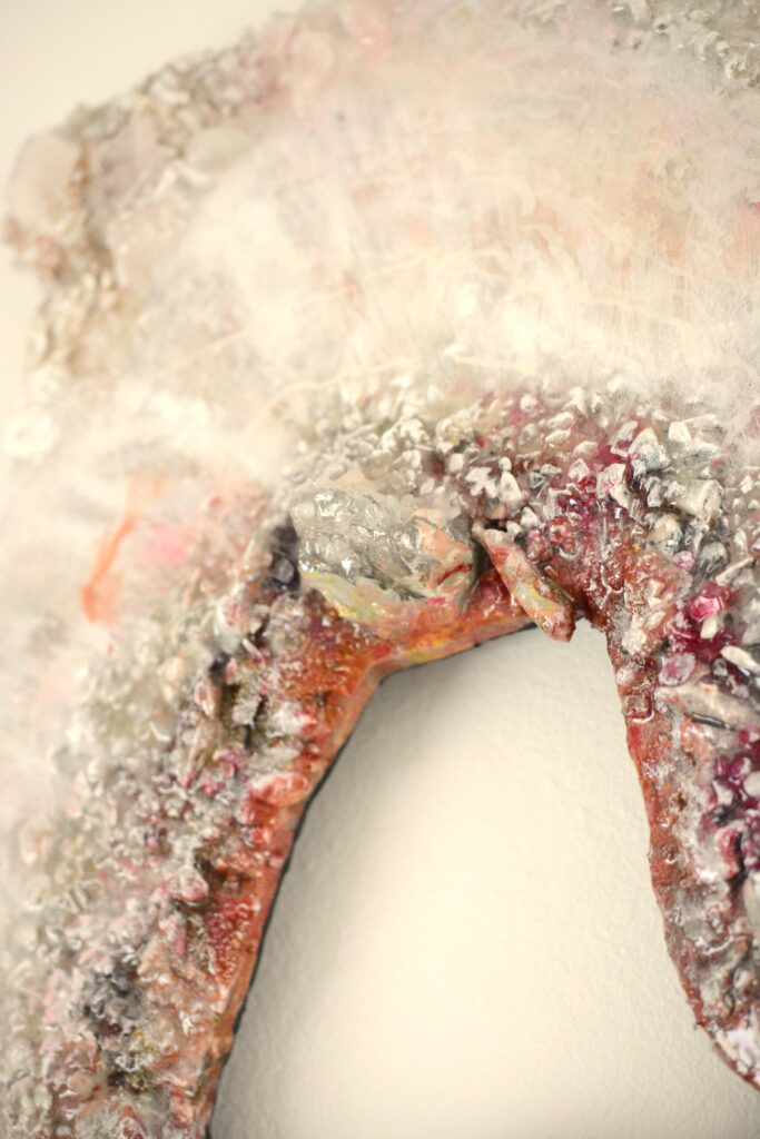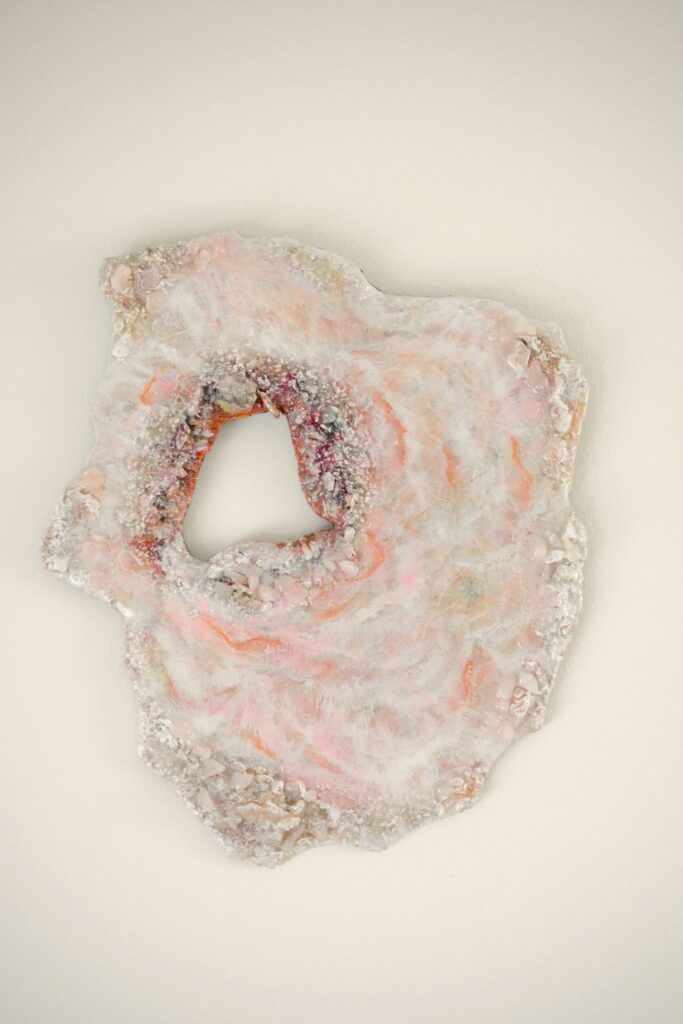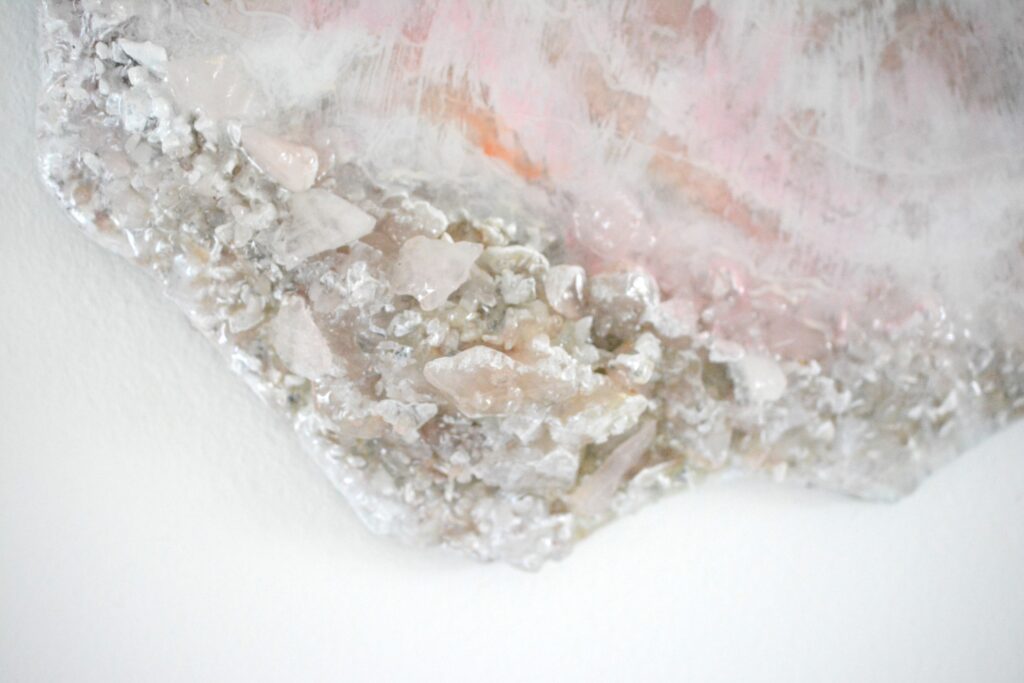 Het creatieproces: 7 lagen hars op mdf in zacht roze tinten, creme wit en beige. Verwerkt met echte edelstenen en kristallen, zoals ruwe Bergkristal, Rozenkwarts, Citrien, Amethist en kopervezels.. De achterzijde is afgewerkt met een laag epoxy en heeft een metalen haak.