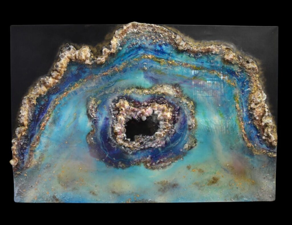 7 lagen hars op leisteen, in turkoois, groen, antraciet en goud nuances.