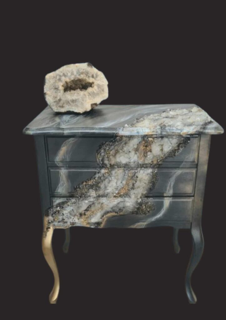 Vanuit een blank teak houten basis zijn de speelse belijningen van de geode tot leven gekomen. De bovenzijde en voorzijde zijn bewerkt met zowel grote als kleine bergkristalpunten, ruwe bergkristal, en fijne chips-bergkristallen. Shunigite, Pyriet, en zwarte Toermalijn zorgen voor mooie contrasten. De linkse poot is goud geschilderd, voor een shiny look.