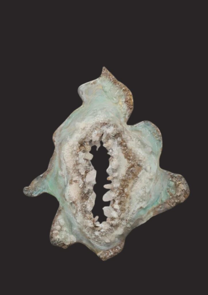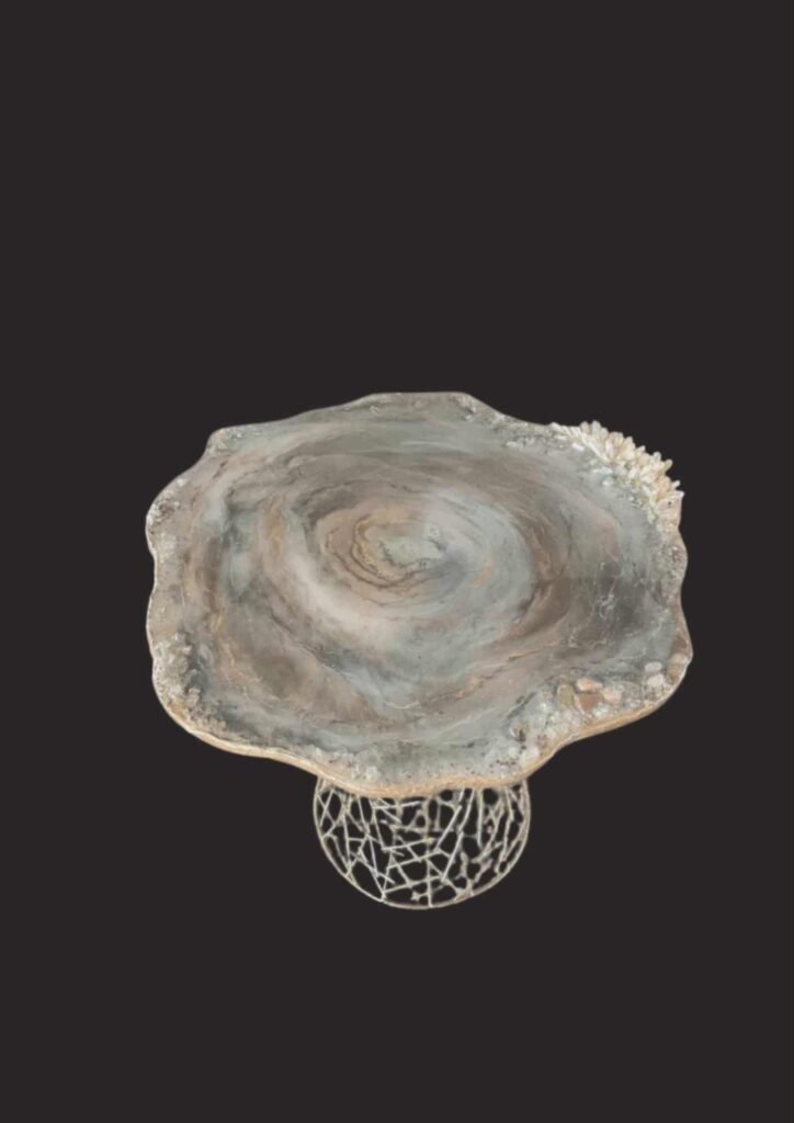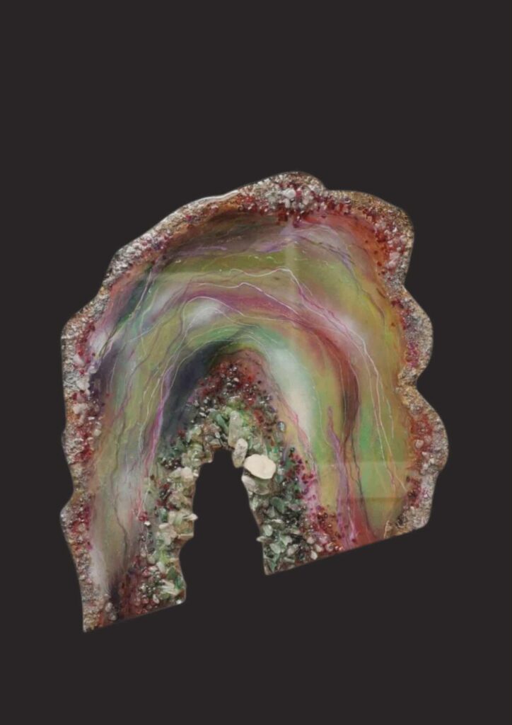De randen zijn ontstaan door een combinatie van structuurpasta, mortel, kopervezels en epoxy te mengen. Hierop zijn kleine edelstenen verwerkt zoals pyriet, shungite, hematiet. In de kern zijn grote bergkristalpunten, amethisten en ruwe rozekwarts met kopervezels te zien.