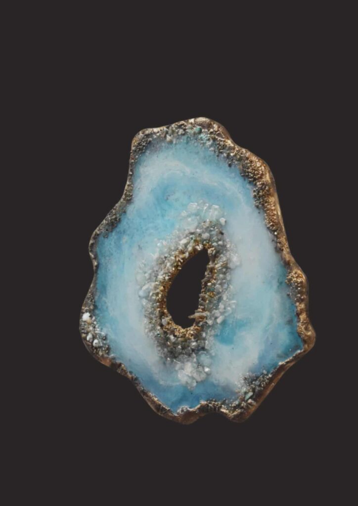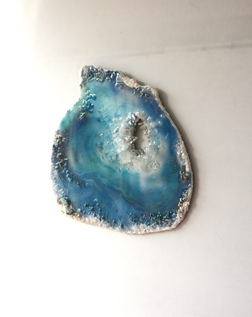 Het creatieproces: 7 lagen hars op mdf in turkoois blauw nuances, met echte edelstenen en kristallen. De achterzijde is afgewerkt met een laag epoxy en heeft een metalen haak.