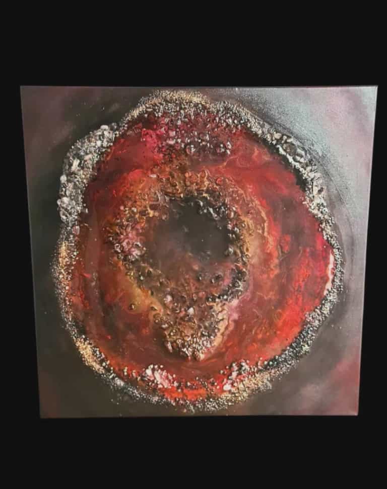 Op canvas is deze geode ontstaan. Een mix van ruwe kleine edelstenen, kwartspoeder, kopervezels en epoxy hebben de texturen van de geode bepaald. Vurig kleuren rood, oranje, en goud zijn in de lagen hars verwerkt, waardoor dit kunstwerk tot volle expressie is gekomen.