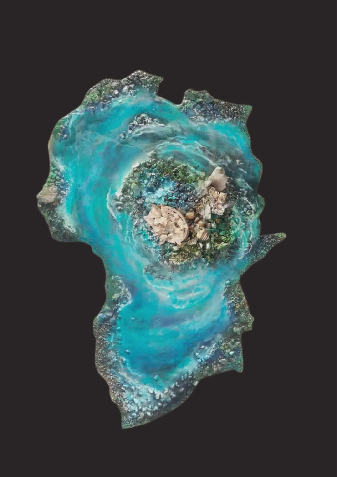 Op een basis van mdf is in 7 lagen de epoxy met de verschillende turkoois/blauw nuances verwerkt. De diepte is in dit kunstwerk prachtig te zien. Het eiland heeft meerdere schelpen die gevuld zijn met echt mos, kristal-klusters, grote punt kristallen, mosagaat, aventurijn, lapis lazulli. De randen zijn opgewerkt met epoxy-klei en kopervezels, waar enkele kristallen op verwerkt zijn.